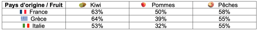 Qu’est-ce que cela signifie au quotidien ? Suivons Naëlle, une adolescente qui va au marché avec ses parents, et qui met initialement dans son panier : 11 kiwis produits en France, 15 pommes produites en Italie et 9 pêches venant de Grèce. On suppose que son panier contient, pour chaque type de fruit, un pourcentage de fruits contaminés par des pesticides correspondant à celui trouvé par PAN dans son rapport – et dont on a extrait des données en Annexe.