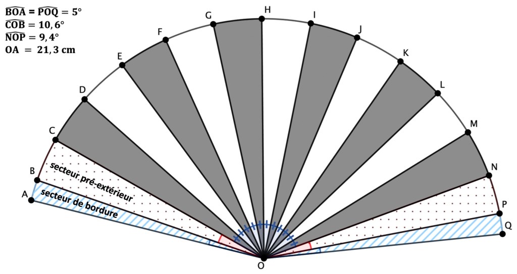 En Annexe, on a schématisé cet éventail, qui, en position ouverte, est similaire à une portion de disque de rayon 21,3 cm et divisée en 15 secteurs centrés en un point O, avec des angles d’ouverture différents :