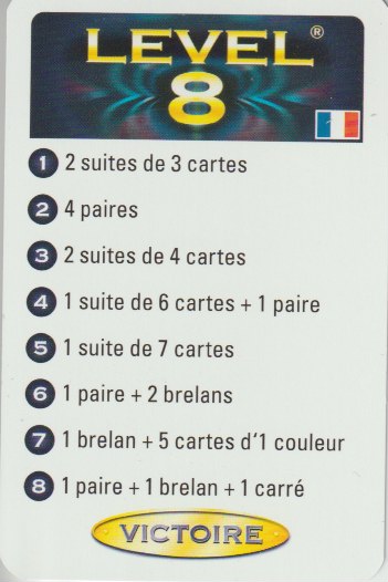 Jeu basé sur la chance et la stratégie, « Level 8 » est un jeu à défis. A partir de 10 cartes, il faut réussir à passer les 8 niveaux en réalisant à chaque fois la combinaison imposée (voir sur l’Image 1 ci-dessous les 8 défis à réaliser tout au long du jeu). La difficulté du défi imposé augmente au fur et à mesure que les niveaux sont franchis. On s’intéresse dans ce jeu aux nombres de combinaisons de cartes qui permettent de réaliser les défis existants.