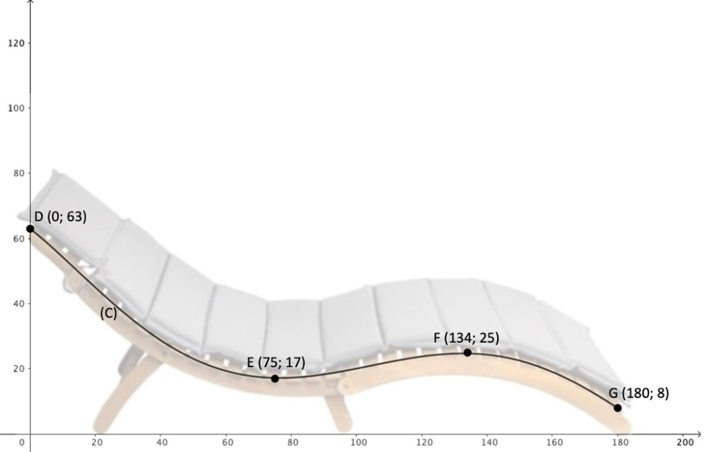 On étudie justement dans ce problème le profil de deux de ces chaises. La première d’entre elle, courbée, est représentée schématiquement sur le repère en Annexe 1. Le profil de la chaise est celui d’une courbe (C), représentative d’une fonction f. On a placé sur (C) les points extremums : le point D, le plus en arrière en haut de la chaise, est placé sur l’axe des ordonnées. En Annexe 2, on a représenté sur un autre repère une autre chaise longue, un transat, formé de deux parties rectilignes [TR] et [RS] qui permettent notamment au dos de rester droit. Sur les deux repères, l’unité des axes est en centimètres, l’axe des abscisses représentant le sol.