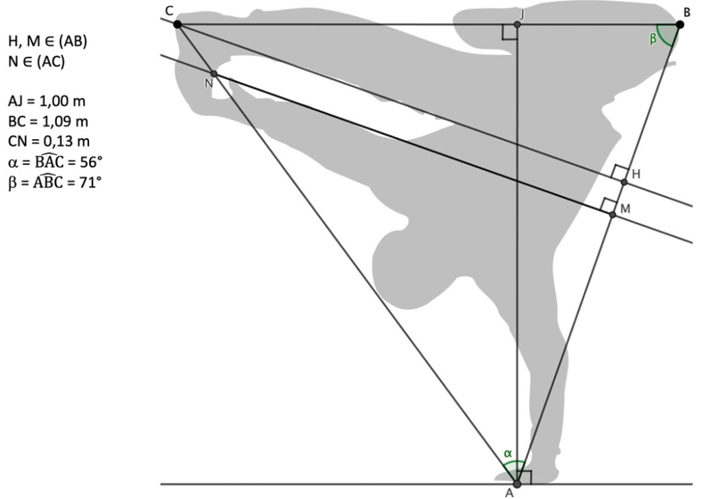 Les données chiffrées sont fournies à côté de la figure en Annexe, notamment certains angles du triangle ABC, la hauteur AJ à laquelle s’élève le corps en freeze, ou encore CN qui est en quelque sorte la grosseur du pied (la distance entre le dessous du talon et le cou-de-pied).