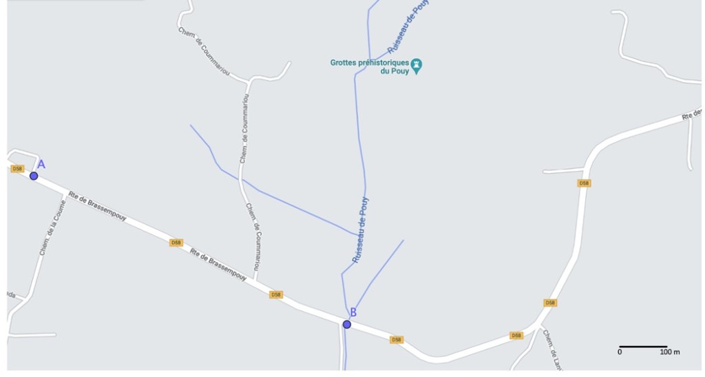 – A 300 mètres de la route de Brassempouy, qu’on peut assimiler à la droite (AB) sur le plan en Annexe.