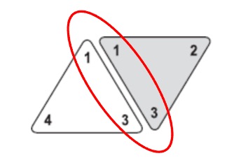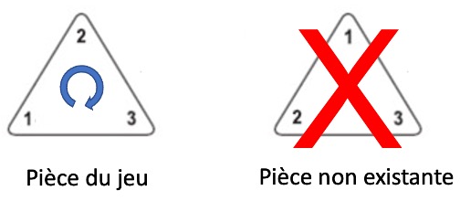 5) Sur une pièce de Triomino, on remarque de plus qu’en partant du numéro le plus petit porté, on va trouver les deux numéros suivants, dans l’ordre croissant, en tournant dans le sens des aiguilles d’une montre : par exemple on trouvera ainsi le Triomino 1 – 2 – 3 mais pas le Triomino 1 – 3 – 2 (voir Annexe 2).