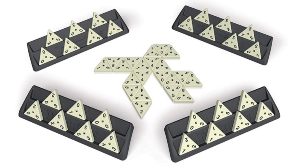 On connait bien sûr les dominos. Les Triominos, un jeu sorti en 1965, en sont une déclinaison plutôt faciles à comprendre : au lieu d’être formés de deux nombres, les Triominos sont des triangles équilatéraux dont les sommets portent des numéros de 0 à 5. On pose un Triomino contre un autre si les sommets adjacents de deux Triominos ont des numéros qui correspondent strictement (voir figure en Annexe 1). Le nombre de points marqués est la somme des numéros contenus dans le triangle posé : cette somme va donc de 0 (Triomino 0 – 0 – 0) à 15 (Triomino 5 – 5 – 5).