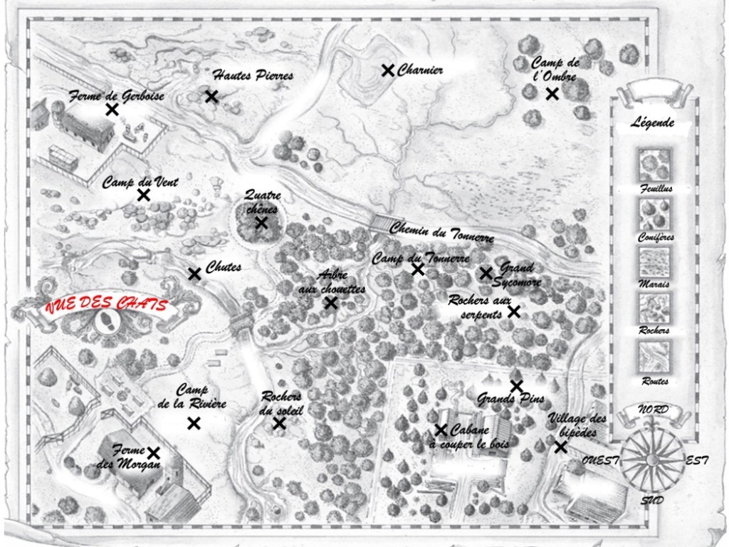 Une carte des Clans, telle qu’elle est perçue par les chats (« La vue des chats ») se trouve en Annexe. On y a indiqué différents lieux connus des chats. On admettra que les lieux sont désignés précisément par des croix, bien qu’ils soient en fait des zones.