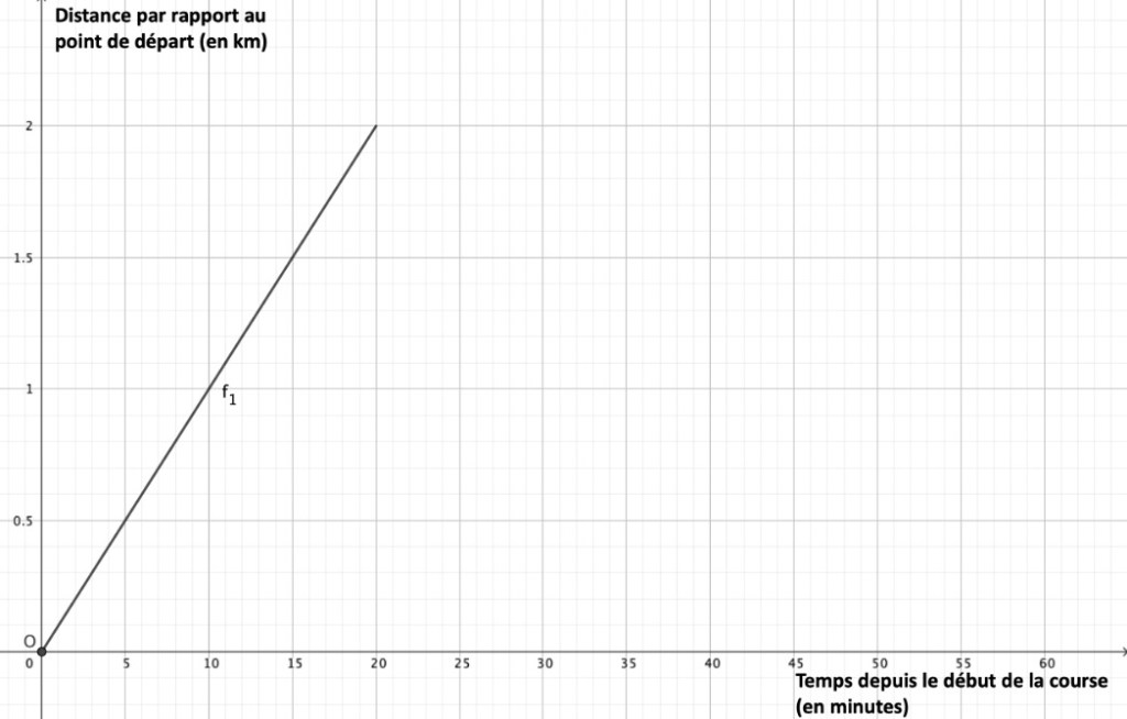 On modélise ce parcours, dans un repère en Annexe 2, par une succession de 5 portions de droites associées à des fonctions affines, chacune représentant une des étapes. La fonction affine fk représente la k-ième étape, sur l’intervalle approprié. L’abscisse t représente le temps en minutes depuis le début de la course, et l’ordonnée la distance (en km) du canoë de l’équipe BA par rapport au point de départ.