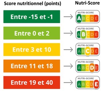 Moins connu, le score nutritionnel est celui qu’on calcule, à partir des informations dont on dispose sur un produit alimentaire, pour justement déterminer son Nutri-score. Ce score est un nombre de points entiers entre -15 et 40. La correspondance entre score nutritionnel et Nutri-score se fait selon le document visible en Annexe.