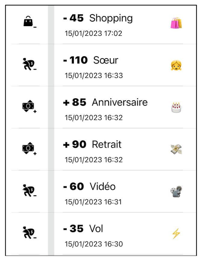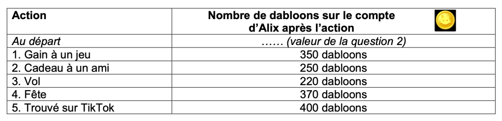 1) Alix installe sur son téléphone une application qui lui permet de suivre son compte. Il décrète que sa fortune initiale est de 150 dabloons (pourquoi pas, après tout ?). Il fait ensuite une série d’actions, auto-déclarées, qu’on peut voir sur l’écran d’un téléphone en Annexe, et qui lui font gagner ou perdre des dabloons.
