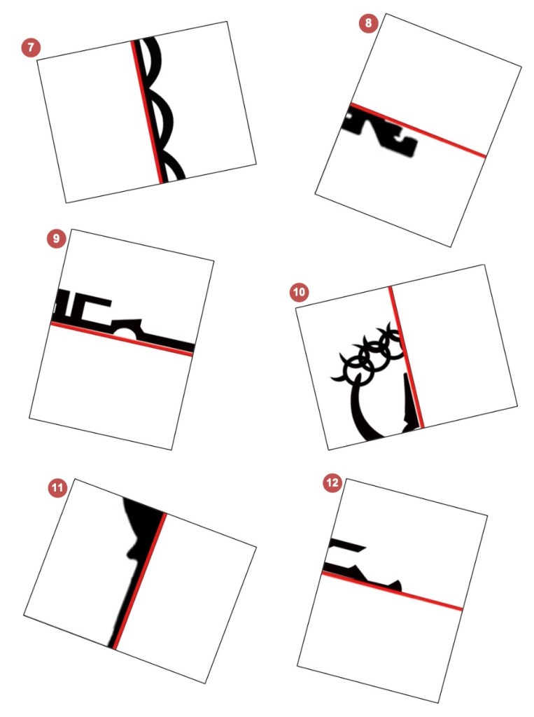 1) Retrouver sur chacun des 12 morceaux la moitié disparue – symétrique de l’autre moitié par rapport à l’axe rouge – en la construisant précisément.