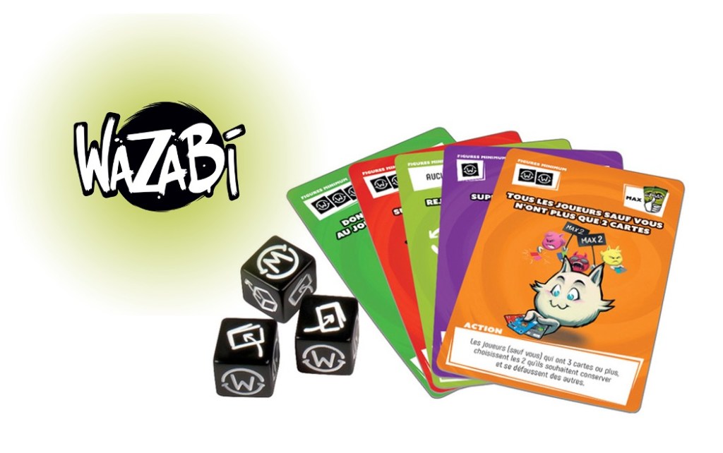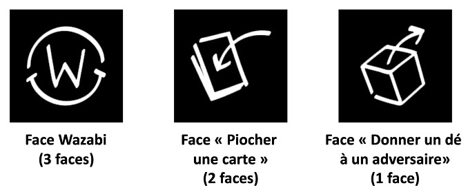 Décrivons d’abord les dés et les cartes. Tous les dés sont équilibrés et identiques et un dé possède 3 types de faces : face « Wazabi » (visible sur 3 faces du dé), face « Piocher une carte » (sur 2 faces), et une face « Donner un dé à un adversaire » (sur une seule face) (voir Annexe 1). Les cartes, elles, donnent chacune une instruction. Le joueur qui voudrait utiliser une carte à son tour après son lancer de dés ne peut le faire que si le nombre de faces « Wazabi » qui apparaissent au lancer est au moins égal au nombre de « Wazabi » visibles sur la carte, en haut, à gauche (voir exemple en Annexe 2).
