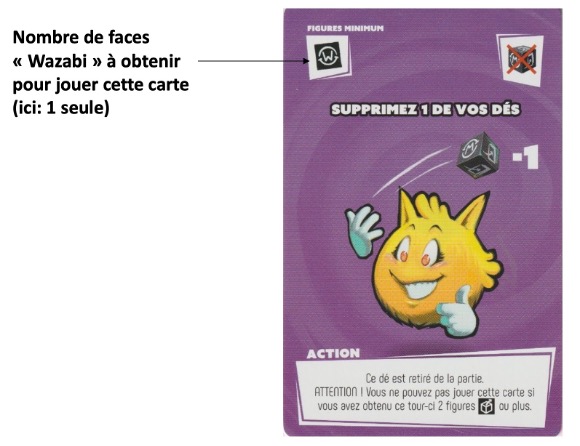 b) Aucune carte ne permet à Jonathan de se débarrasser du dé s’il ne fait pas apparaître au moins une face « Wazabi » dans le lancer de dés(*).