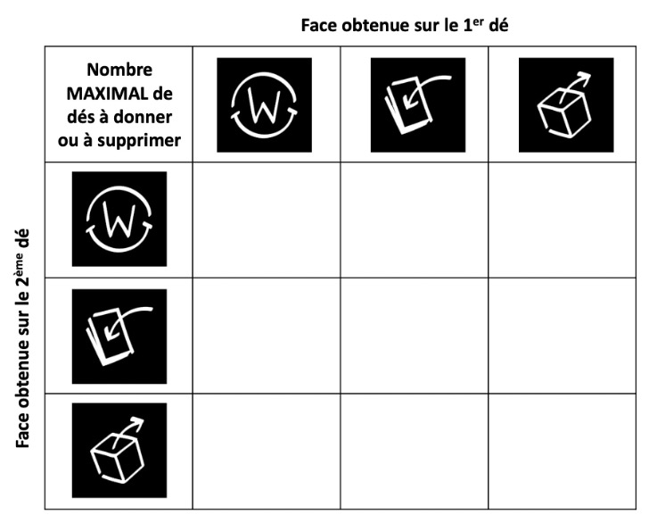 a) Remplir le Tableau 1 ci-dessous qui donne le nombre MAXIMAL de dés que Ludovine pourrait donner ou supprimer en fonction des faces observées lors du lancer des deux dés.