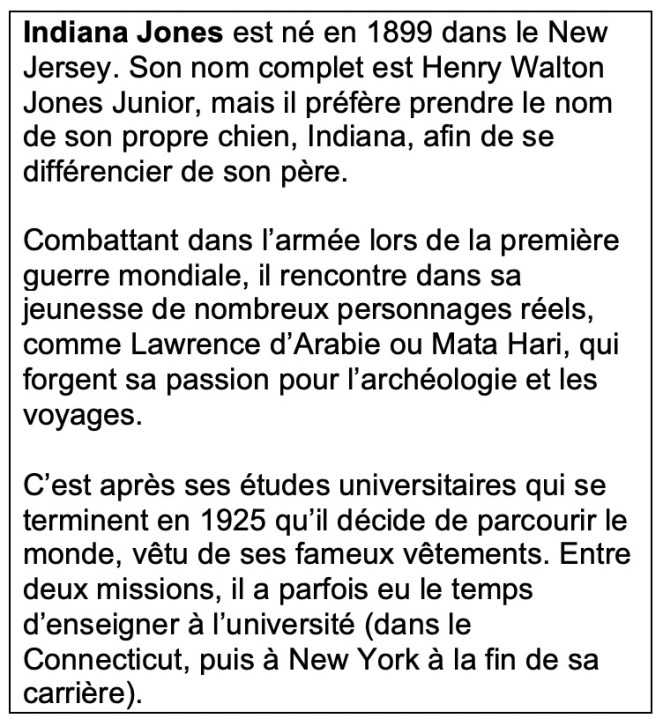 – Document 2 : Une biographie fictive du personnage d’Indiana Jones.
