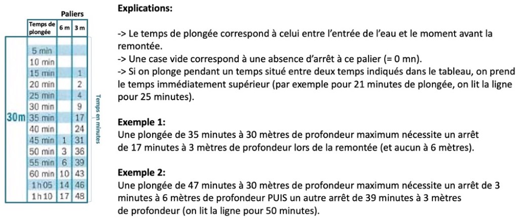 Ces temps sont fournis par des tables que les plongeurs expérimentés connaissent. En France, la plus connue d’entre elle est la MN90. En fonction du temps passé dans la plongée (entre l’entrée dans l’eau et le début de la remontée), et la profondeur maximale atteinte, la table indique le temps à passer à chaque palier avant de sortir de l’eau. Un extrait d’une table, pour une plongée simple à une profondeur maximale de 30 m, et des explications sur la manière de lire la table, sont donnés en Annexe 1.
