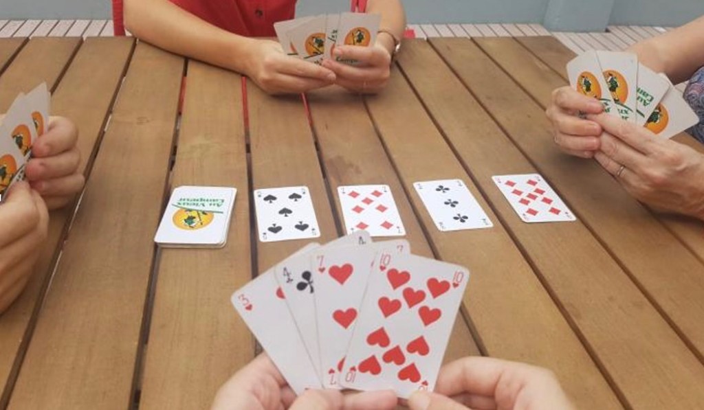 Le Kem’s fait sans aucun doute partie des jeux de cartes préférés des enfants, car il est simple et ludique. Pour ceux qui ne le connaissent pas, le jeu oppose deux équipes de deux joueurs.ses qui se font face (comme sur la photo ci-dessus). Chacun reçoit quatre cartes et essaye de former un carré en jetant une carte puis en prenant une dans les quatre cartes situées au milieu du jeu (tous les joueurs jouent simultanément). Chaque joueur.se a toujours quatre cartes : si à un moment, après des échanges successifs, aucun.e joueur.se n’est intéressé.e par les cartes au milieu, on les remplace par quatre nouvelles cartes de la pile. Quand on a formé un carré, on tente de faire un signe à son ou sa partenaire, qui, si il ou elle le voit, dit « Kem’s ». Mais attention à l’équipe adverse, qui pourrait détecter la formation de votre carré formé et dire « Contre-Kem’s »…