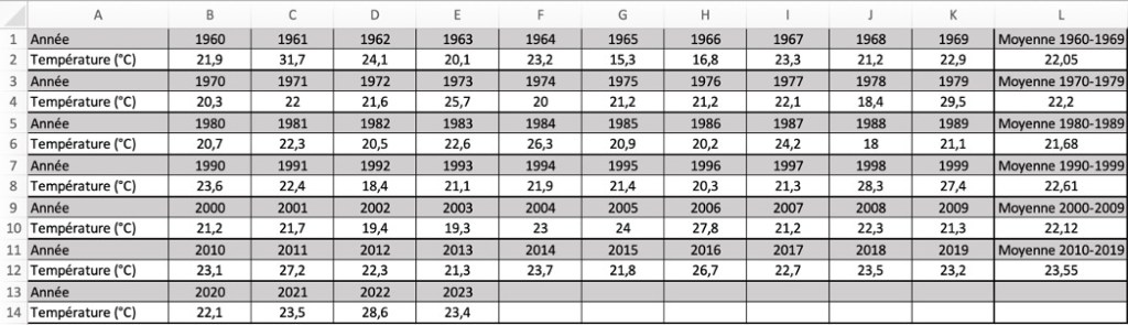 4) Dans le tableau, on a calculé, en colonne L, la moyenne des températures par décennie.