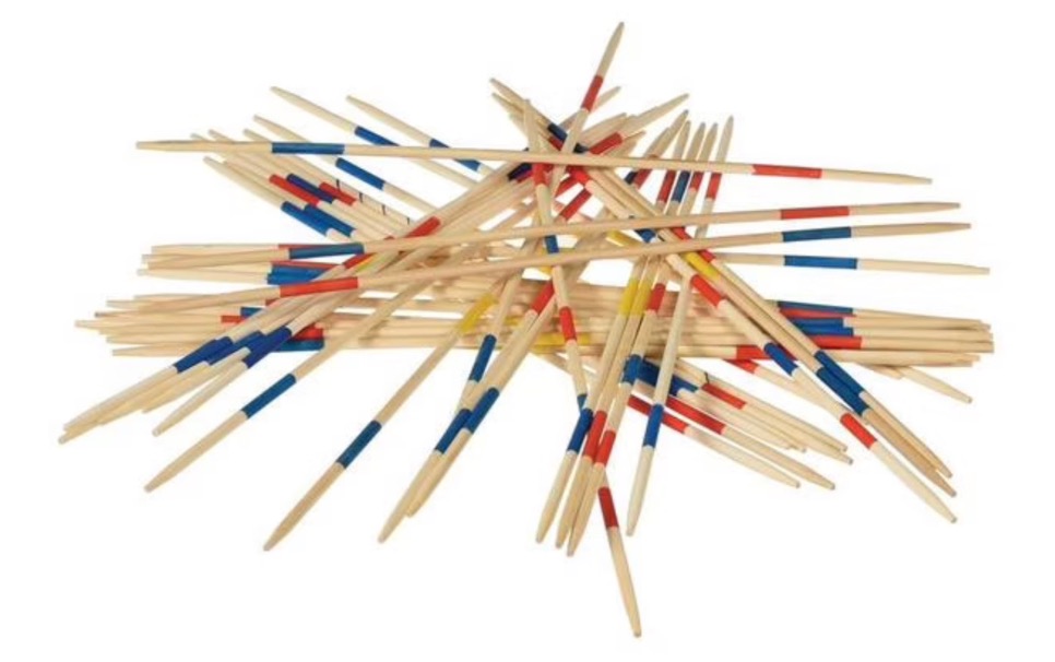 Jeu familial par excellence, le Mikado consiste à retirer un à un des bâtonnets de bois qui ont été empilés sur la table en vrac, comme sur la photo ci-dessus. La difficulté est de ne rien faire bouger d’autre que le bâtonnet que l’on retire. Ce jeu requiert du doigté et surtout de la patience !