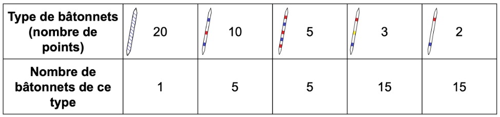 Les bâtonnets, traditionnellement au nombre de 41, donnent un nombre de points variable selon le motif qu’ils portent. Ces nombres de points, et le nombre de bâtonnets de chaque type, sont résumés dans le Tableau 1 ci-dessous.
