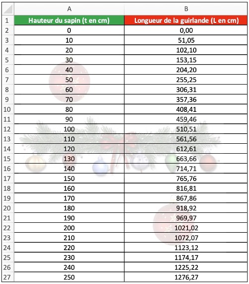5) « La longueur idéale des guirlandes lumineuses est égale au périmètre d’un cercle dont le diamètre serait égal à la hauteur de l’arbre» (tout en cm).