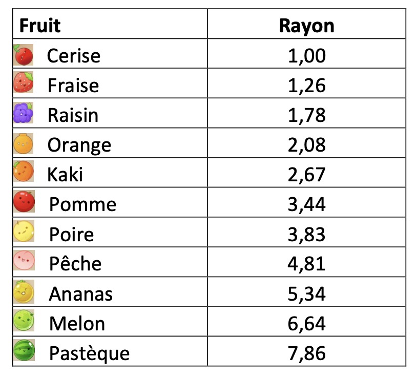 On a rassemblé dans le tableau en Annexe 1 tous les fruits du jeu. Même s’ils ne sont pas tous absolument circulaires (par exemple la fraise ou le raisin), on admet pour ce problème qu’ils le sont et qu’ils ont un rayon, sachant que 1 unité de longueur est égale au rayon du plus petit fruit, c’est-à-dire la cerise. Ces rayons sont donnés dans le tableau en Annexe 1.