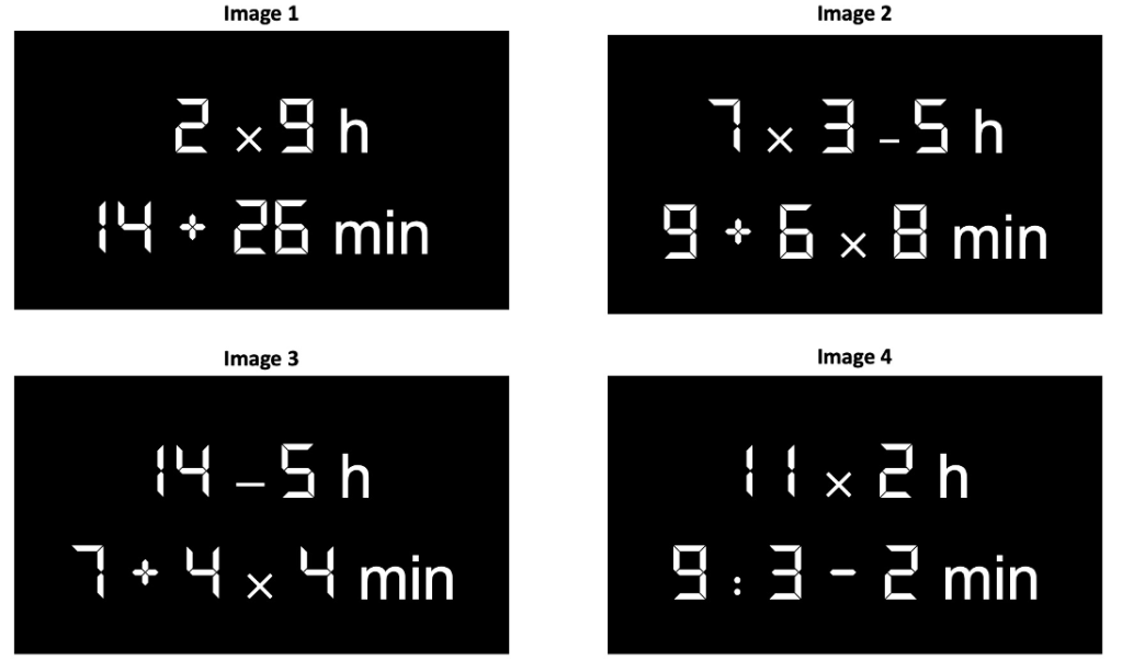 3) Déterminer deux calculs différents permettant à l’Albert Clock d’afficher 20 H 24 sous la forme : « a S1 b S2 c H d S3 e S4 f min » où a, b, c, d, e, f sont à remplacer par des chiffres tous différents entre 0 et 9 et S1, S2, S3, S4 sont à remplacer par des signes opératoires (+, – , x, ÷) pas forcément différents.