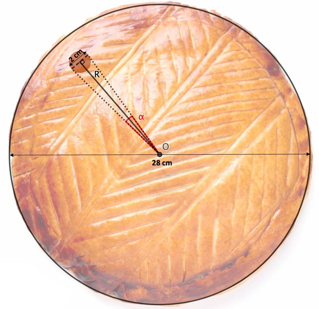Pour ce problème, on va prendre une galette pour 8 personnes dont le diamètre fait 28 cm. La fève est assimilée à un disque de diamètre 2 cm et son centre est placé à une distance R (en cm) du centre de la galette.