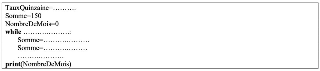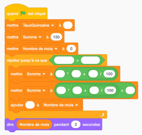 a) A l’aide du taux trouvé dans la question 3.b), compléter et exécuter les programmes (Scratch ou Python) dans les fichiers associés au problème (429 – Programme.sb3 et 429 – Programme.py) ou en Annexe 2, pour déterminer en quel mois et en quelle année Malone aura dépassé le plafond du livret, c’est-à-dire 1 600 euros.