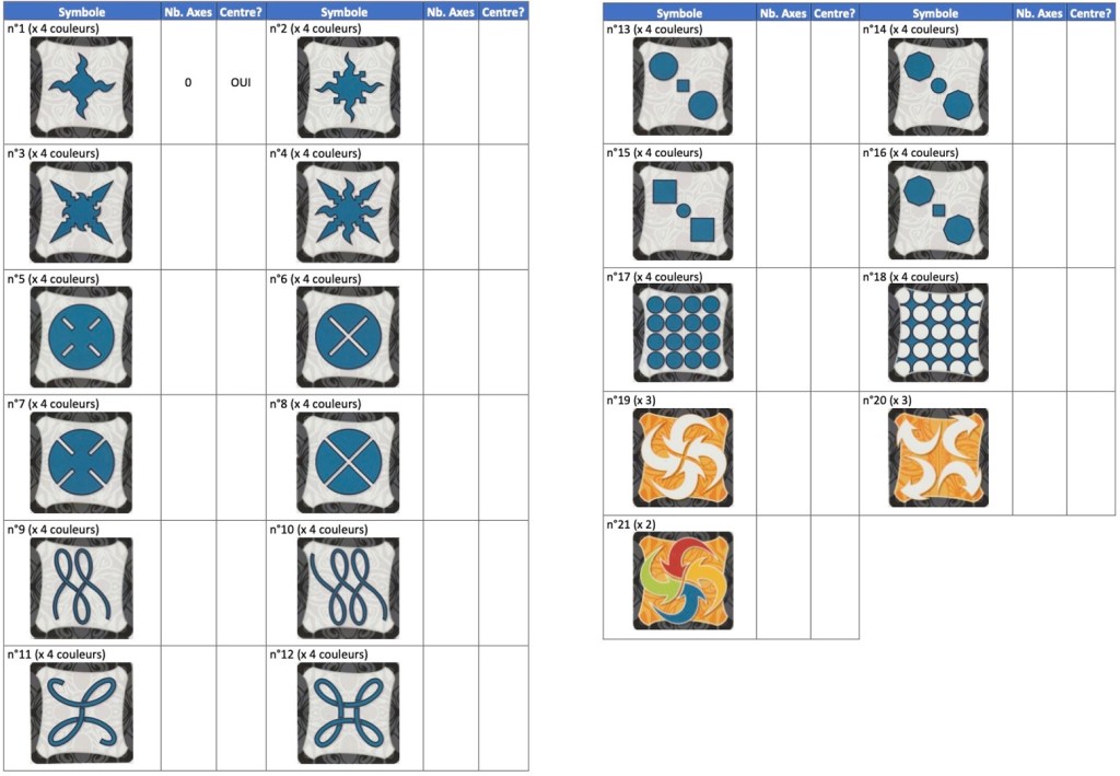 1) Remplir le tableau en Annexe en indiquant pour chaque symbole le nombre d’axes de symétrie, et si la figure contient ou pas un centre de symétrie (un exemple est donné pour le symbole n°1).