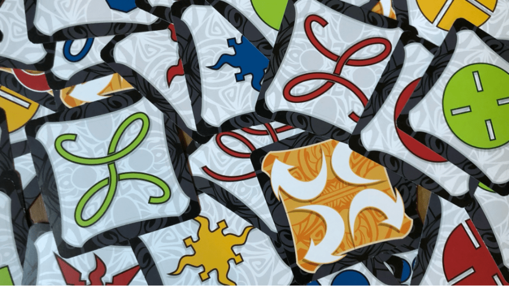 Le jeu Jungle Speed – où il faut attraper le totem quand deux cartes avec le même symbole apparaissent – est un grand classique : il a déjà plus de 30 ans ! Dans sa version de base (donc hors des extensions), il contient 80 cartes carrées: 72 cartes « standard », réparties en 18 symboles différents déclinés en 4 couleurs (bleu, jaune, rouge, vert), et 8 cartes avec des symboles spéciaux : 3 « flèches vers l’intérieur », 3 « flèches vers l’extérieur » et 2 « flèches de couleur ». Sans qu’il ne soit nécessaire de comprendre les règles du jeu, nous allons nous intéresser dans ce problème à toutes les symétries contenues dans les cartes, pour ensuite calculer quelques probabilités.