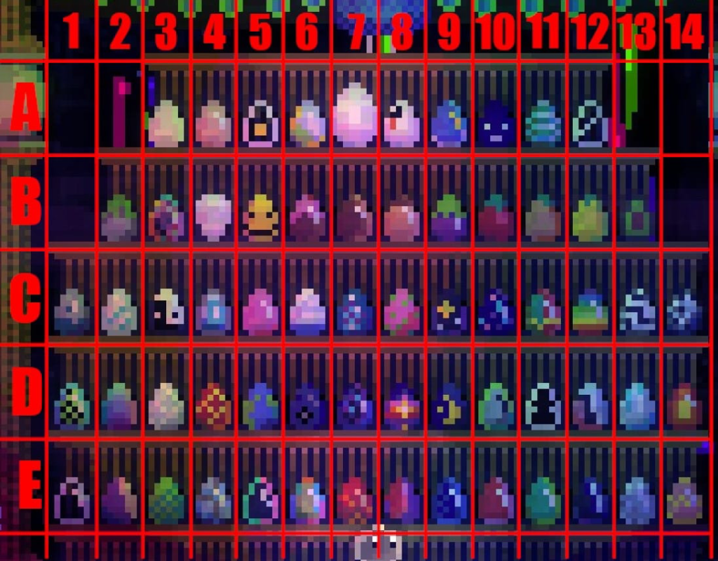 Une grande partie du jeu consiste ainsi à retrouver 64 œufs (qui permettront d’accéder au 65ème…), que le blob range dans la « salle du paon ». Mandy, une collégienne qui a tout de suite adopté le jeu, a réussi à récupérer tous les œufs (non sans mal !) pour les placer dans cette salle qui contient une forme d’étagère : celle-ci, une fois remplie, ressemble à ce qui est montré sur l’image en Annexe. Pour faciliter la compréhension de la position des œufs, on a attribué à chaque œuf une lettre et un numéro désignant respectivement sa position verticale et sa position horizontale. Ainsi, par exemple, un œuf positionné en D5 est situé sur le quatrième niveau en partant du haut (ou le deuxième en partant du bas), et à la 5ème position en partant de la gauche.