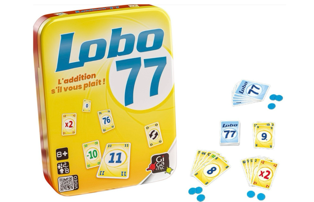 Dans la famille des jeux d’ambiance où les nombres ont un rôle déterminant, on trouve, au même titre que « 6 qui prend ! » ou « Skyjo », Lobo 77. Le principe du jeu est simple : chaque joueur a toujours 5 cartes en main et possède au départ 3 jetons. Il ou elle ajoute tour à tour une carte sur une pile commune, additionne le nombre indiqué sur la carte au total précédent (au départ, on part de zéro), puis pioche une nouvelle carte. Si le total obtenu tombe sur un « doublet », à savoir les valeurs 11, 22, 33, 44, 55, 66 ou si le total dépasse 76 (auquel cas on repart d’un total égal à zéro), le joueur qui a posé la carte perd un jeton. Le gagnant est celui qui ne perd pas tous ses jetons. Éviter les mauvais nombres est moins facile qu’il n’y paraît.