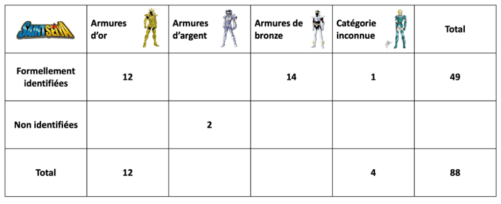 Selon le « Récit des Guerres Saintes », il existe 88 armures du Sanctuaire divisées en 4 catégories : or, argent, bronze… et « inconnu ». Les 12 armures d’or, dont les noms sont associés aux signes du zodiaque, sont les plus puissantes. Pour le reste, la répartition des armures selon les catégories est précisée en Annexe, sachant qu’il y a dans chaque catégorie une séparation entre celles formellement identifiées et celles non identifiées, car jamais mentionnées dans le manga.