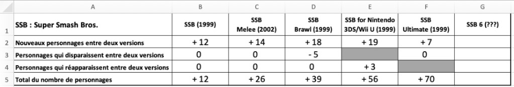 5) Dans le tableau, on étend la formule de la cellule C5 à la cellule G5. Quand la prochaine version de Super Smash Bros. apparaîtra, que peut-on dire entre le nombre y et le nombre qu’il faudra entrer en cellule G3?