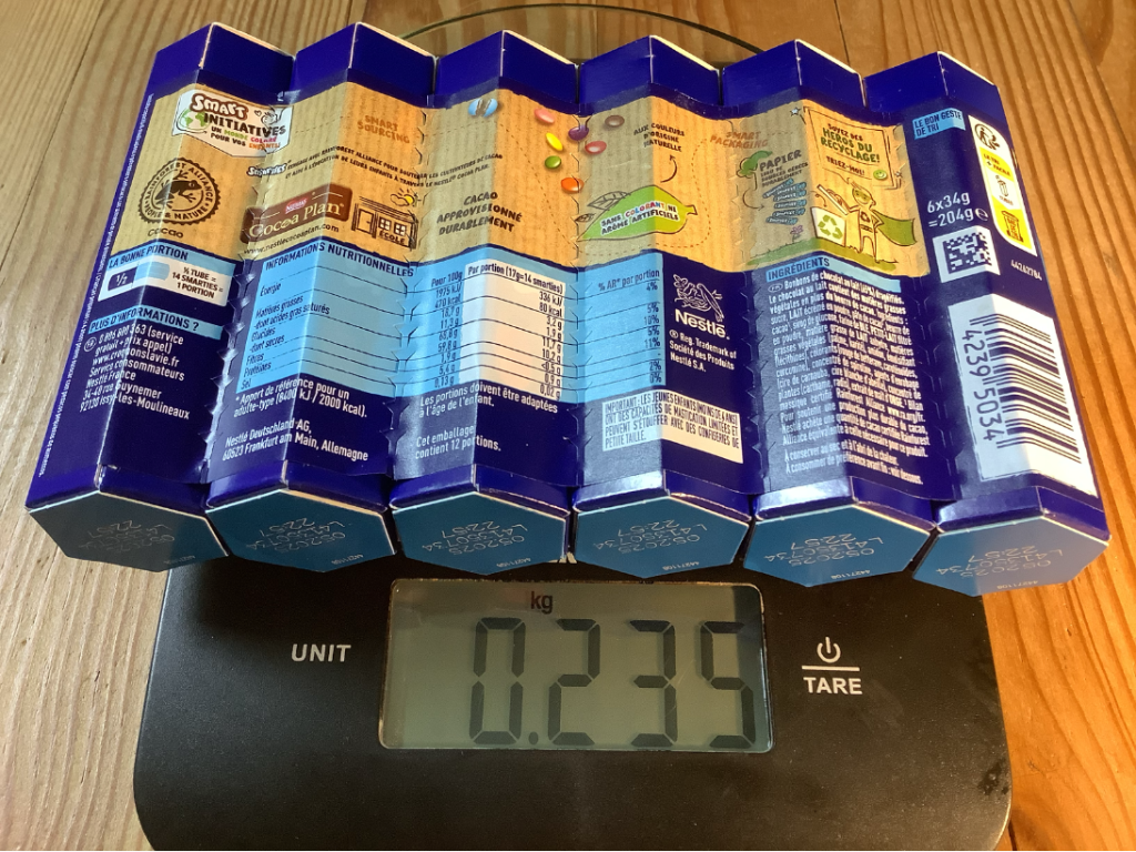 Le paquet que l’on trouve aujourd’hui dans les supermarchés (image ci-dessus) est ce bloc de 6 hexatubes tous identiques de 10 cm de hauteur. En Annexe, on a photographié le dos de ce bloc avec ses informations, et on l’a pesé sur une balance.