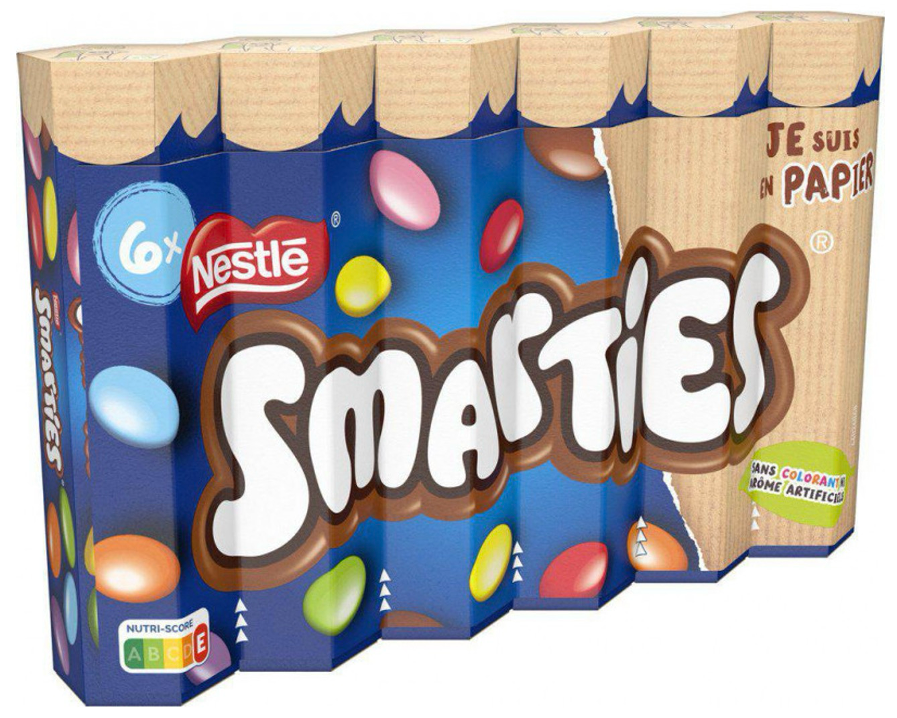 Créés en 1882 au Royaume-Uni par la société Rowntree’s, les Smarties, ces petites dragées de chocolat enrobé, font partie des grands classiques sur les tables d’anniversaire pour les enfants. Alors qu’ils étaient, jusqu’en 2005, distribués dans de longs tubes cylindriques en carton, ils se distinguent aujourd’hui par la forme originale des emballages, des prismes droits à base hexagonale, qualifiés « d’hexatubes ».