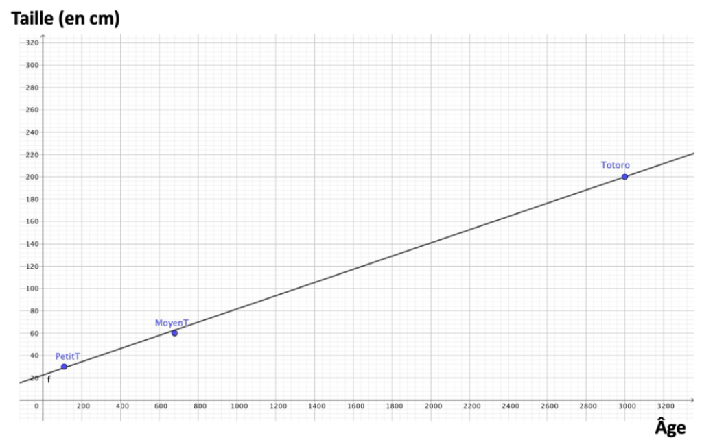 L’auteur du film, Hayao Miyazaki, a indiqué que Totoro a « plus de 3 000 ans ». Il mesure 2 mètres. Le moyen Totoro, lui, a 679 ans et mesure 60 cm. Quant au petit, il a déjà 109 ans pour 30 cm(1). En plaçant sur un graphique, comme en Annexe, la taille des trois personnages, en cm, par rapport à leur âge (on admet pour simplifier que Totoro a exactement 3 000 ans), on s’aperçoit que les trois points placés sont quasiment alignés – d’où la droite tracée! Cela peut ainsi nous laisser admettre, pour ce problème, que la famille Totoro grandit de manière régulière tout le long de cette droite.