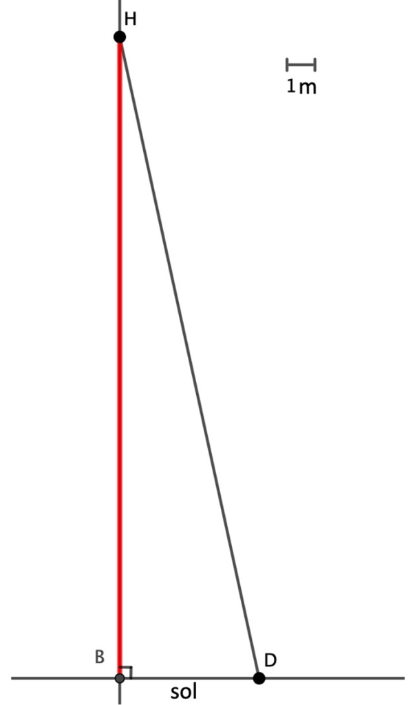 3) On a représenté, en Annexe, la corde de la Tour des héros par un segment vertical [BH] de longueur 23 m, B étant le point au sol et H le sommet. A 5 mètres du bas la corde, au sol, Denis Brogniart, le fameux présentateur de l’émission, regardait Charles grimper entre le point B et le point H. Denis se trouvait au point D.