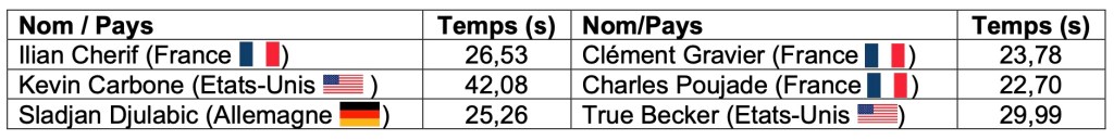 En 2024, l’émission s’est déroulée dans le cadre du « Choc des Nations », où des concurrents de différents pays s’affrontaient. Ils étaient six en finale. Charles Poujade, le Français, a été le plus rapide. Les temps de tous les concurrents, dans leur ordre de passage, ont été indiqués dans le Tableau 1 ci-dessous.