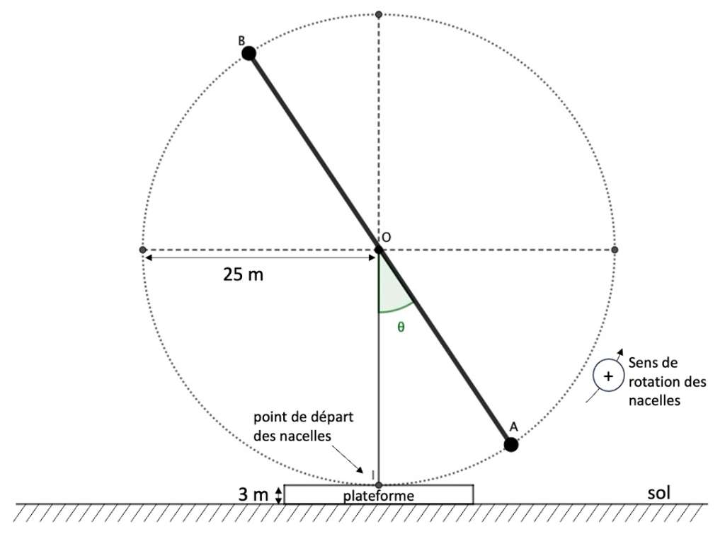 On appelle I le point bas du manège (là où les personnes montent à bord des nacelles, c’est-à-dire le point de départ), situé à 3 mètres de hauteur par rapport au sol, et on appelle θ = IOA(on a donc θ = 0 radians au départ), sachant que la mesure de cet angle inclura le nombre de tours complets faits par la nacelle (elle pourra donc dépasser 2π). On admet que le manège tourne dans le sens contraire à celui des aiguilles du montre ; ainsi, θ sera toujours positif.