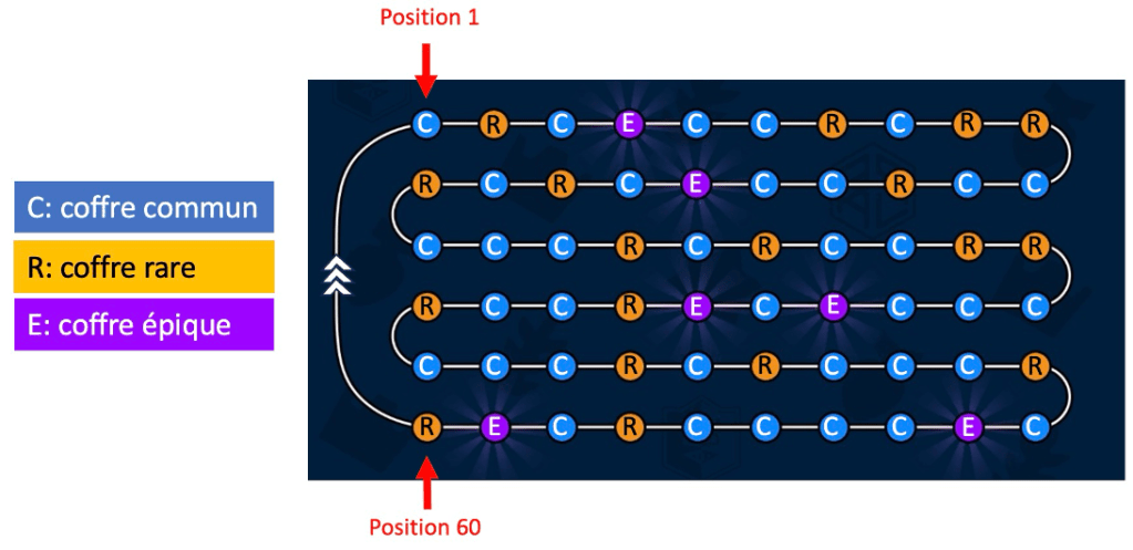 Ce cycle, publié par Supercell(1) et reproduit en Annexe, s’étale sur 60 coffres – 36 communs, 18 rares et 6 épiques – sachant qu’un coffre épique est évidemment celui le plus recherché, car il est le moins fréquent et offre les meilleurs personnages. Connaître sa position dans le cycle permet de savoir quel type de coffre on va obtenir après un match.