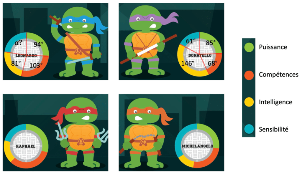 Selon une étude proposée par la société américaine Lemonly(1), les forces de chacune des quatre tortues se répartissent essentiellement selon quatre critères : puissance, compétences, intelligence et sensibilité. Pour chaque tortue, un diagramme circulaire a été établi pour représenter la proportion de chaque critère. Ces diagrammes ont été repris en Annexe : pour certaines tortues, on y ajouté les angles, en degrés, faits au centre du cercle par le secteur associé à chaque critère.