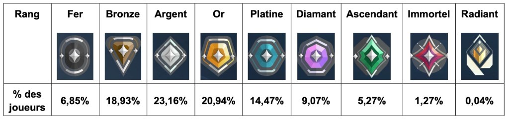 Jeu de tir à la première personne (souvent abrégé FPS – de l’anglais « First-person shooter »), dans la lignée de titres comme Counter-Strike ou Call of Duty, Valorant s’est imposé en quelques années comme l’une des références phares, particulièrement dans l’univers des e-sports. Cependant, devenir un joueur professionnel requiert beaucoup de patience, car très peu ont la capacité de traverser tous les rangs du jeu – c’est-à-dire les niveaux – qui mènent jusqu’au « Radiant », le rang suprême de Valorant. Dans ce problème, on va justement analyser où se situent l’ensemble des joueurs dans ce système de rangs.