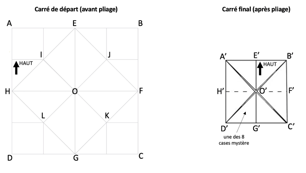 En effet, nous allons ici nous interroger sur les liens qui mènent du carré de départ au carré final – qui est celui qui se forme après deux séquences de plis, et à partir duquel on voit se former les 8 cases mystères. Ces deux carrés sont visibles en Annexe. Pour ce problème on a nommé ABCD le carré de départ (pas encore plié), avec son centre O, les milieux des côtés E, F, G et H, puis I, J, K, L les milieux des quatre « quarts de carré ». On a placé sur ce carré une flèche noire nommée « haut » : quand on forme après pliage le carré final, nommé A’B’C’D’ avec un centre O’, on s’assure ainsi, en tournant si nécessaire ce carré, que cette flèche reste bien orientée vers le « haut ».