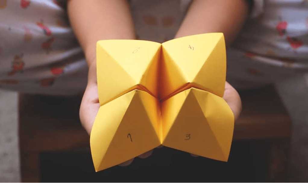 Revenir dans les souvenirs de l’école primaire avec le pliage d’une cocotte en papier (ou salière ? ou pouce-pouce ?…) : c’est ce que nous vous proposons de faire à travers ce problème ! N’avez-vous jamais joué le « diseur de bon aventure » en proposant à vos ami(e)s d’ouvrir une des huit cases mystères ? Si cela n’a jamais été le cas, ou si vous avez besoin d’un petit rappel, construisez votre cocotte (lien : https://ladigitale.dev/digiview/#/v/6806b4048acfb). Cela vous sera très utile pour pouvoir jouer … mais surtout, ici, pour y voir les effets de symétries.