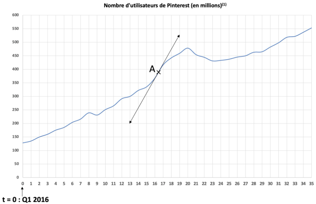 On se propose ainsi d’étudier la courbe, visible en Annexe, du nombre d’utilisateurs de Pinterest dans le monde depuis début 2016 jusqu’à fin 2024. Elle est la courbe représentative d’une fonction f. En abscisse, l’unité t représente le nombre de trimestres écoulés depuis le 1er trimestre de l’année 2016 (on écrira donc qu’à t = 0, on est au « Q1 2016 »). En ordonnée, l’unité est le nombre d’utilisateurs en millions. On pourrait donc écrire par exemple qu’à t = 10, donc au Q3 2018, l’application comptait environ 250 millions d’utilisateurs.