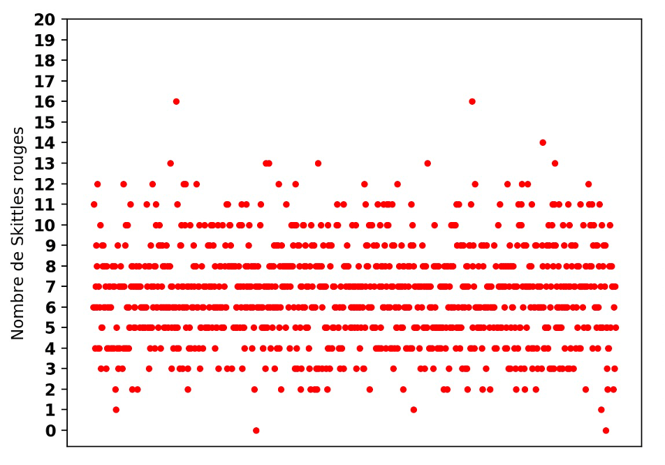 3) En utilisant la fonction skittles_rouges(), on a tracé graphiquement (en Annexe) le nombre de Skittles rouges présents dans 1000 paquets différents de 34 Skittles (chaque point représentant un paquet).