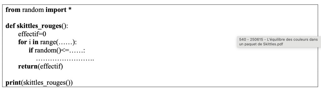 Compléter le programme de la fonction skittles_rouges() ci-dessous pour qu’elle simule le nombre de Skittles de couleur rouge présents dans un paquet de 34 Skittles pris au hasard dans la production.