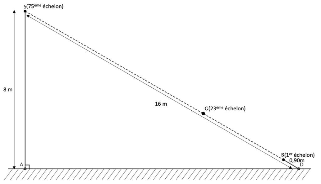 3) Le 1er échelon du plan, au point B, est situé sur le plan incliné à 0,90 m du point de départ D, alors que le 75ème échelon se situe au point S. On suppose que la distance entre deux échelons successifs est toujours la même.
