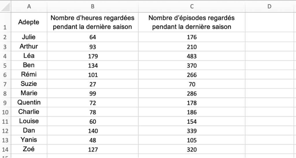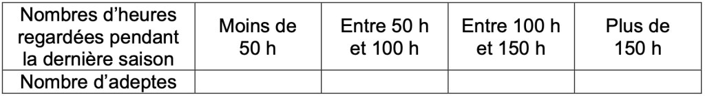 3) Parmi les adeptes interrogés par Loana, calculer la moyenne du nombre d’heures regardées par un adepte pendant la dernière saison.