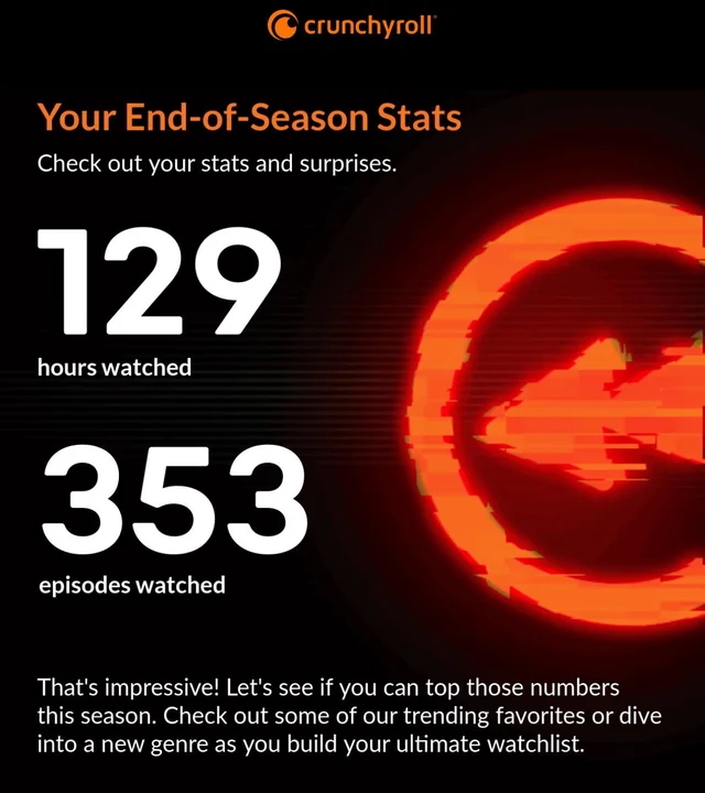 Loana, une fan de Crunchyroll, a pris le temps d’interroger tous les adeptes qu’elle connaît pour savoir combien d’épisodes d’animes ils ou elles ont regardé sur la plateforme lors de la dernière saison, et sur combien d’heures. En effet, un décompte est fourni pour chaque utilisateur à chaque fin de saison, comme on peut le voir sur l’image ci-contre.